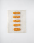 Frozen, skinless boneless strips of formed MSC Pollock portions, coated in bread crumbs.
