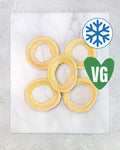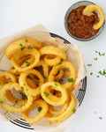 Onion (36%), Batter (64%):{Water, wheat flour, sunflower oil, maize starch, wheat starch, salt, maize flour, raising agents (E450i, E500ii), yeast, stabilizers (E412, E415), onion powder, colour (E101ii), anti-oxidant (E306)}.
